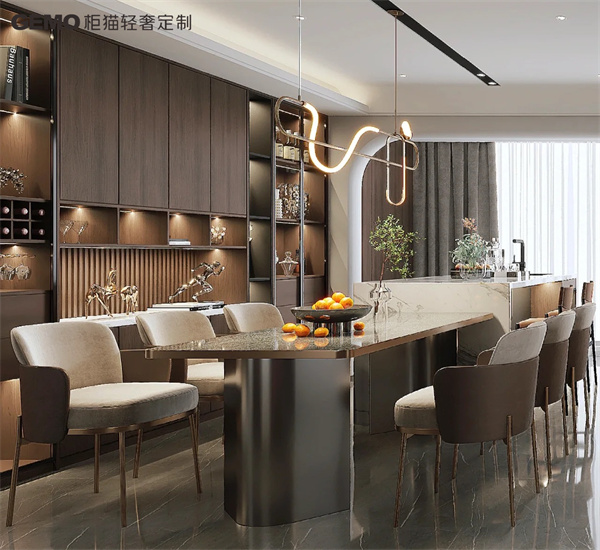 輕奢風家具一般都會搭配金屬材質。它是輕奢風的的一個亮點,寥寥幾筆的金屬線條,就能將室內整體的效果拉高了幾個檔次,再加上一些吊燈、射燈、隱藏燈帶等,輕奢氣質體現的淋漓盡致。